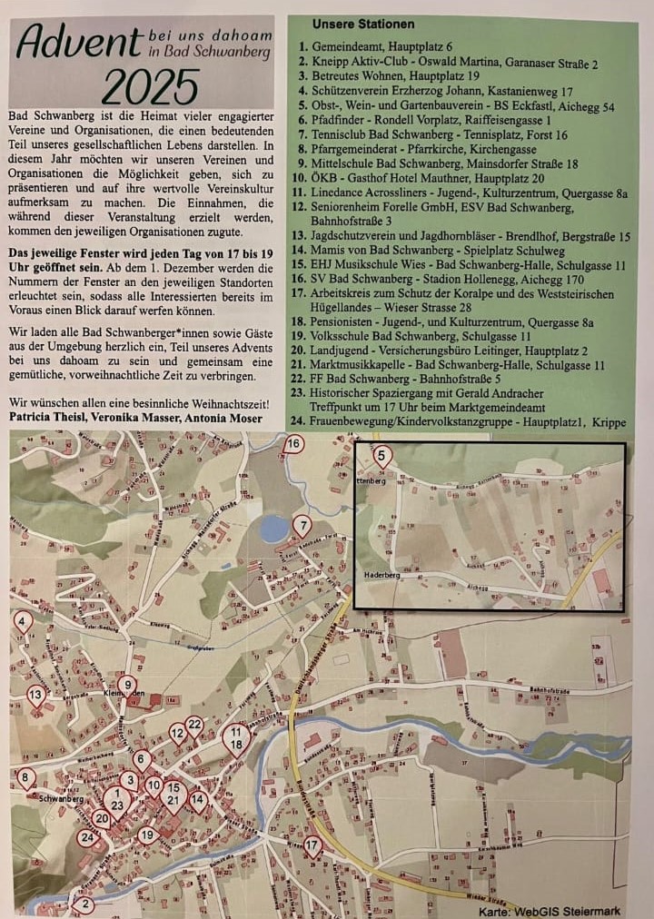 Advent in Bad Schwanberg Posted on 1. Dezember 20252. Dezember 2025by KoralmschutzJetztin Allgemein, News Am 17. Dezember öffnet der Arbeitskreis zum Schutz der Koralpe und des Weststeirischen Hügellandes sein Adventfenster in Bad Schwanberg und lädt herzlich ein, von 17 bis 19h in der Wieser Strasse 28 vorbeizuschauen.